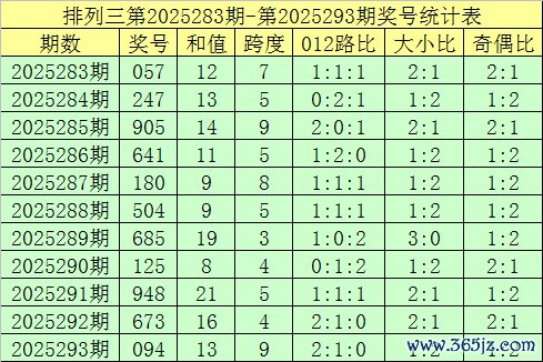 开奖转头:摆列三第2025293期奖号开出:094,组选类型:组六,大小比为1:2,奇偶比为1:2,和值为13,跨度为9。